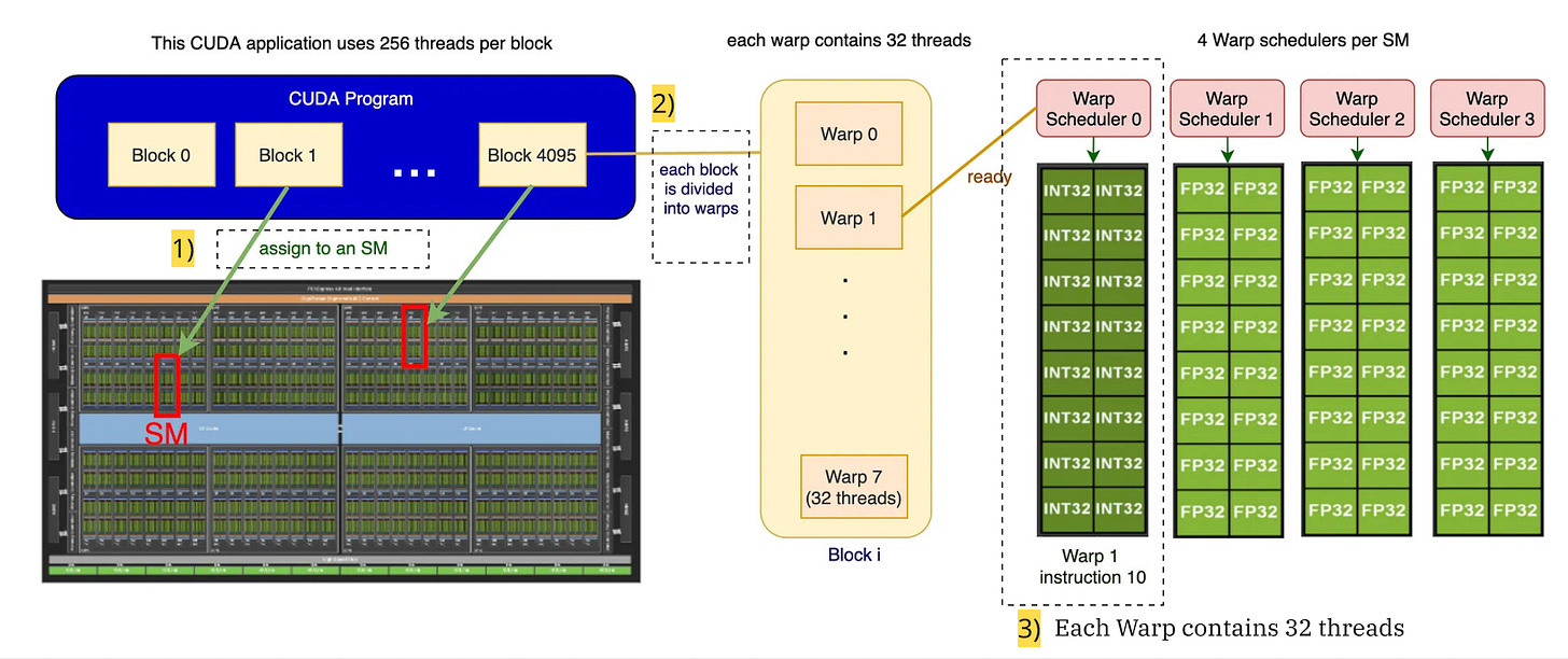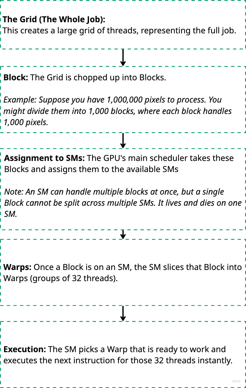 GPUs have many SMs (Streaming Multiprocessors) which are essentially the atomic units. Even when we code in Triton, we are operating at the SM level. Each SM independently executes “blocks” of jobs.