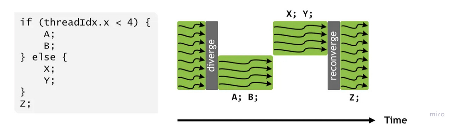 if thread_id < x...) inside a kernel, you fracture the Warp. The hardware must serialize execution, running theifpath while theelsethreads sleep, and then vice versa.The Fix: We design kernels to minimize branching or use “predicated execution” (masking) to keep all 32 threads in a Warp active and synchronized, maximizing instruction throughput.