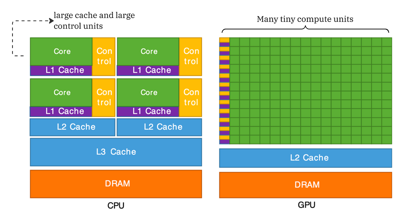 Massive Parallelism: A GPU contains tons and tons of ALUs which are managed by smaller control units. Unlike CPUs with big control units, here a single Control Unit issues one instruction (e.g.,