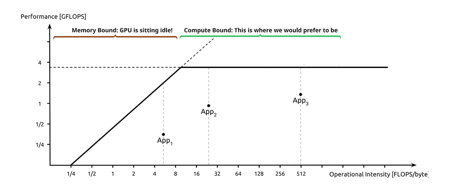 The Roofline Model is a visual performance model used to determine the limiting factor of a specific process (say, a Kernel) running on a specific GPU. It plots Performance (GFLOPS) against Arithmetic Intensity (FLOPs/Byte).