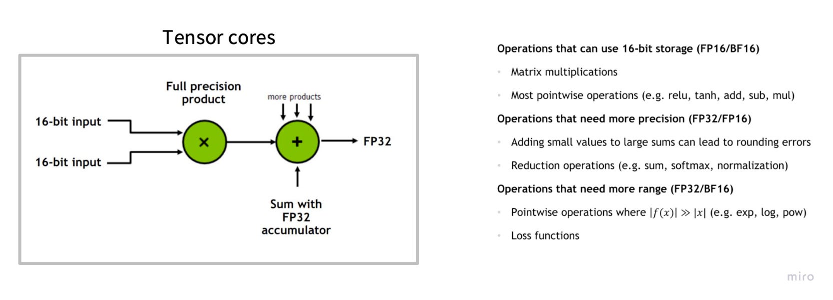 Compute: Modern GPUs (H100/A100) have specialized Tensor Cores that execute low-precision matrix multiplies (A × B + C) at 2x–4x the speed of standard FP32 cores. We trade a tiny amount of numerical precision for massive gains in arithmetic intensity and raw FLOPS.