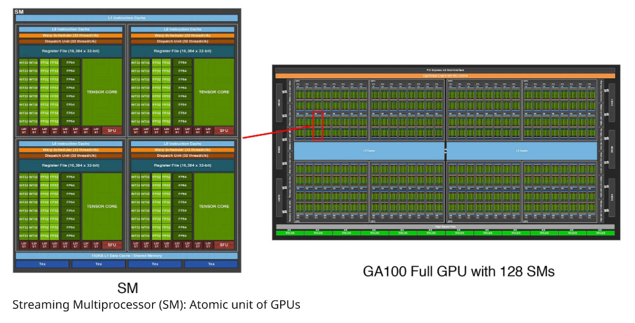 Each SM further contains many SPs (Streaming Processors) that can execute “threads” in parallel.