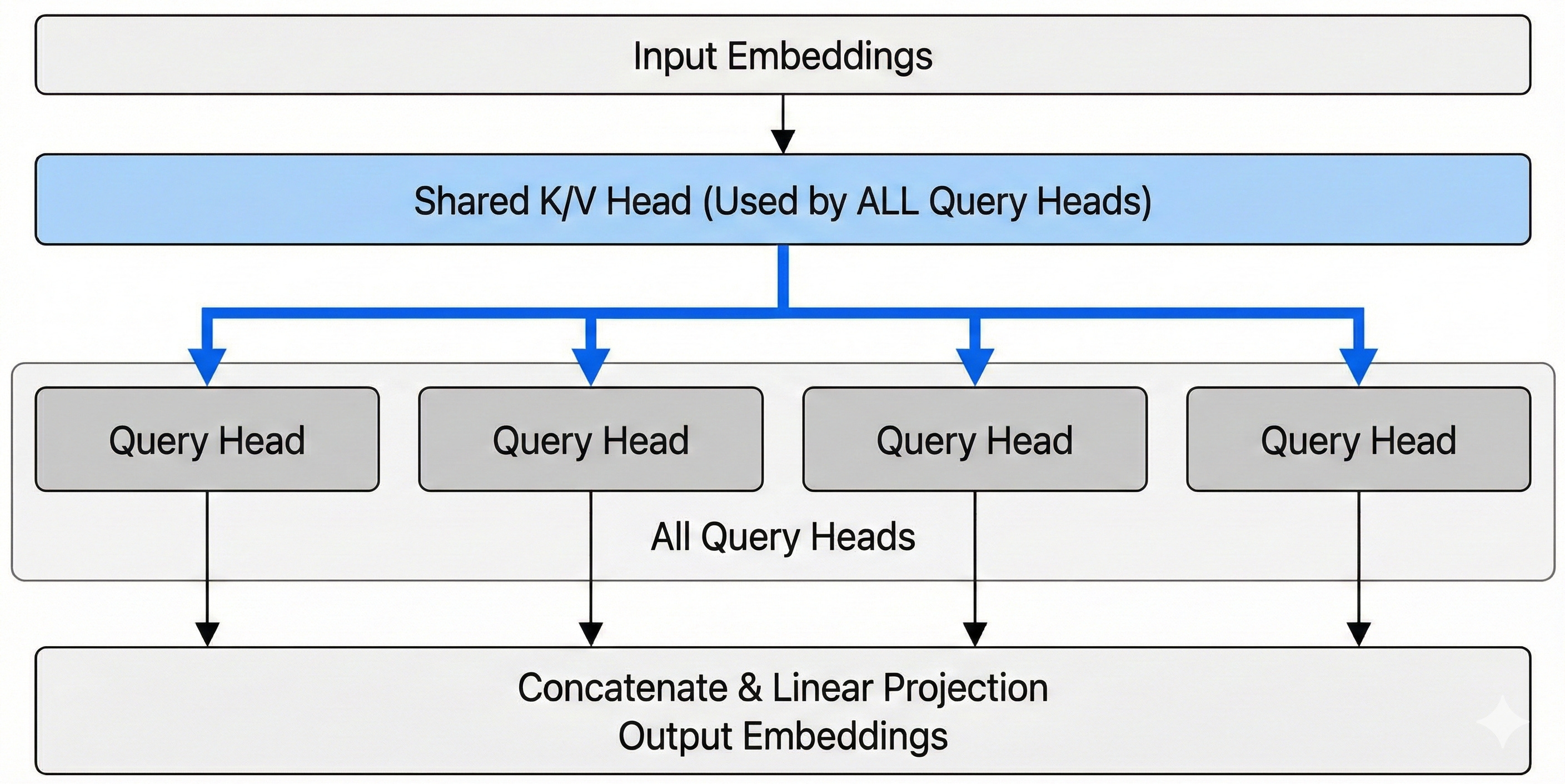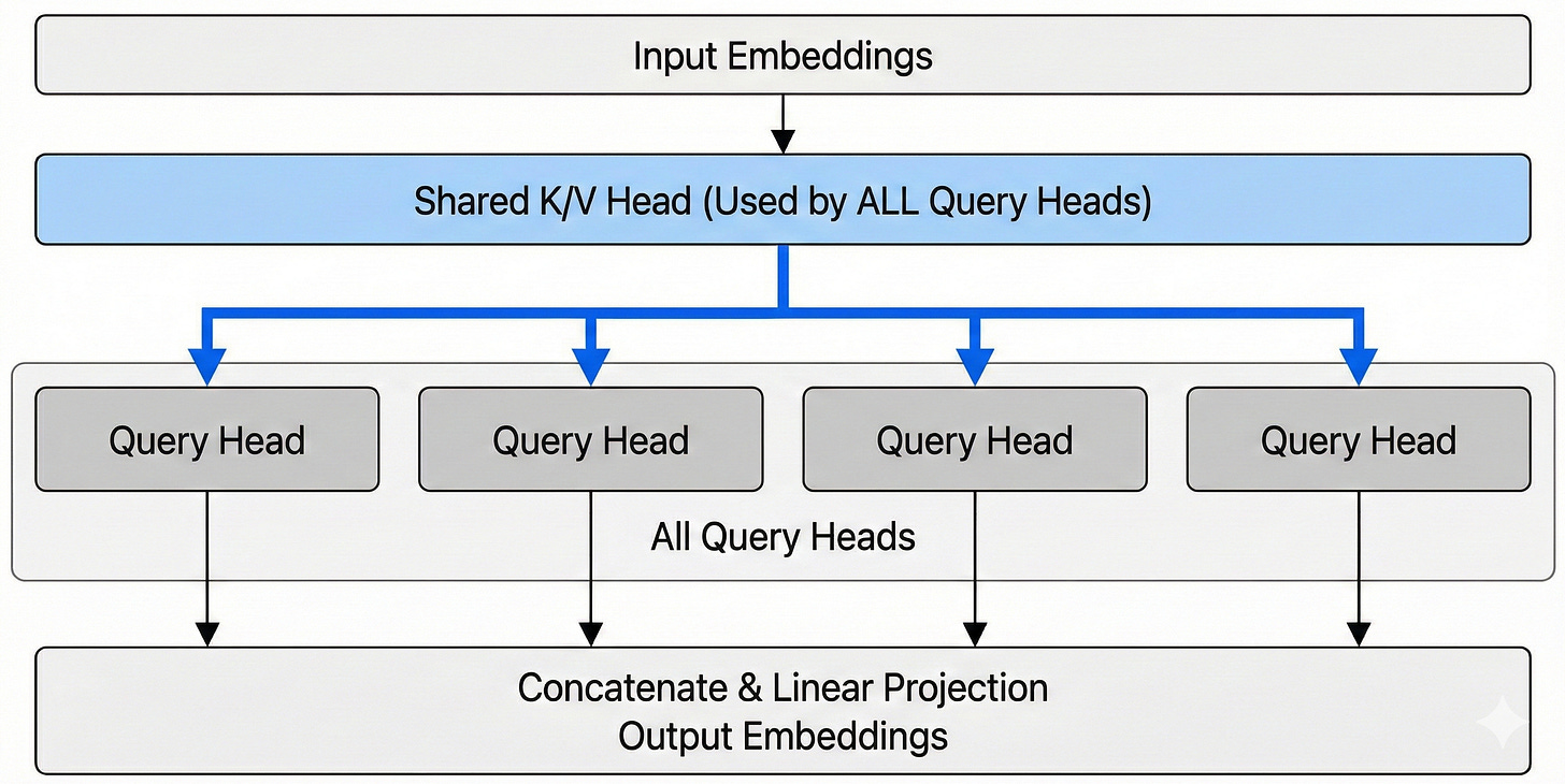 Shazeer proposed Multi-Query Attention (MQA). The core insight of MQA was that the redundancy in the Key and Value heads across different attention heads was largely unnecessary for model performance, yet incredibly expensive for memory bandwidth. While the Queries need to be diverse to ask different questions of the context, the Keys and Values (the representation of the context itself) could be shared.