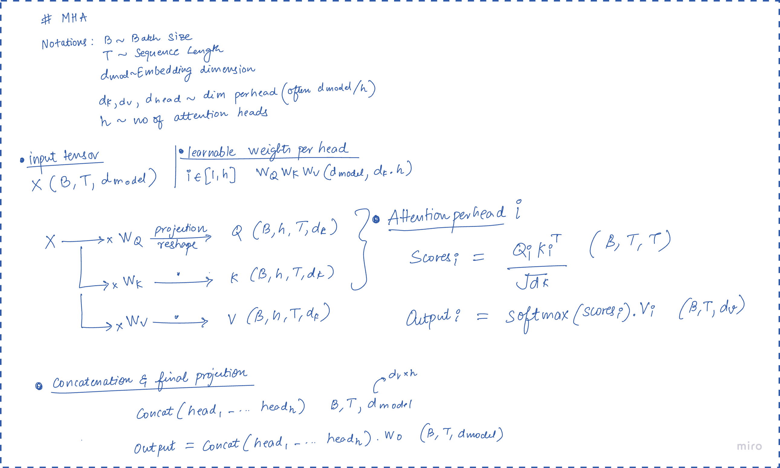 For a quick recap, below image summarises a tensor first intuition for multi-head attention.