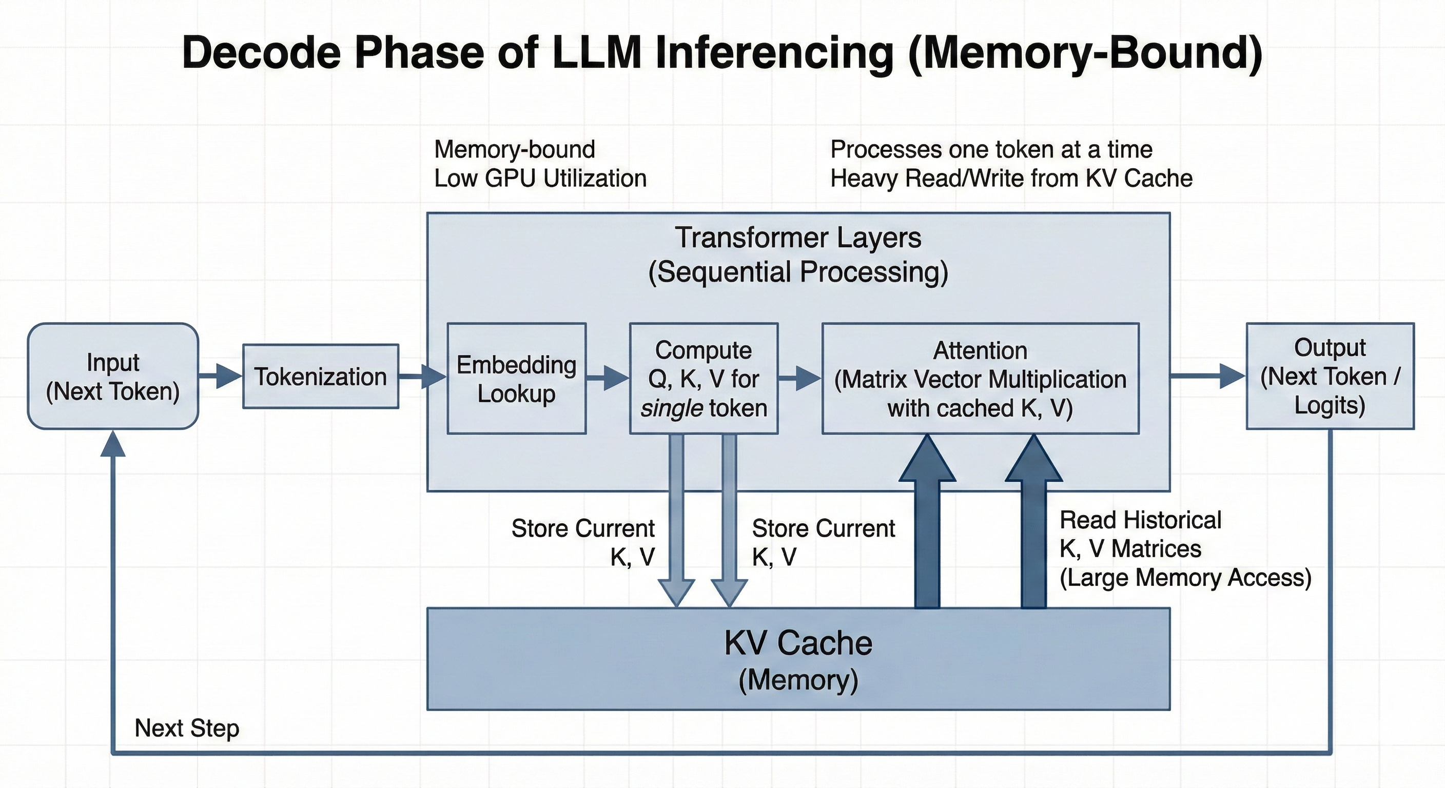 In the training phase, the entire sequence is available at once. The attention matrix Q.dotK_T is computed as a monolithic matrix multiplication (GEMM), which is highly efficient on GPUs. However, inference is autoregressive. The model generates token t_n based on t_1, t_2 …. t_n−1, then generates t_n+1, and so on.