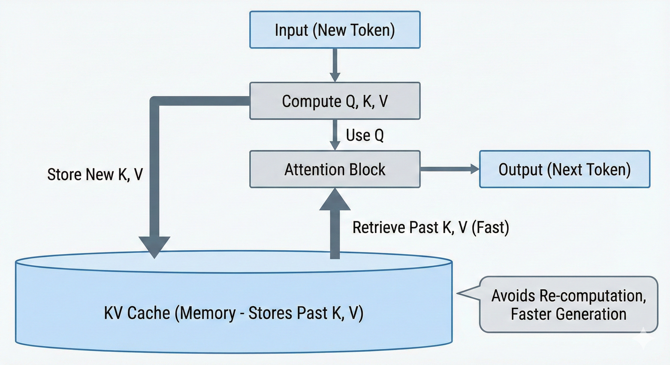 To fix this, the Key and Value vectors for past tokens are computed once, as they are generated, and stored in GPU memory. This storage is the KV Cache. The KV Cache transforms the attention operation from a quadratic compute problem into a linear memory problem. Instead of recomputing, the model simply reads the history from VRAM.