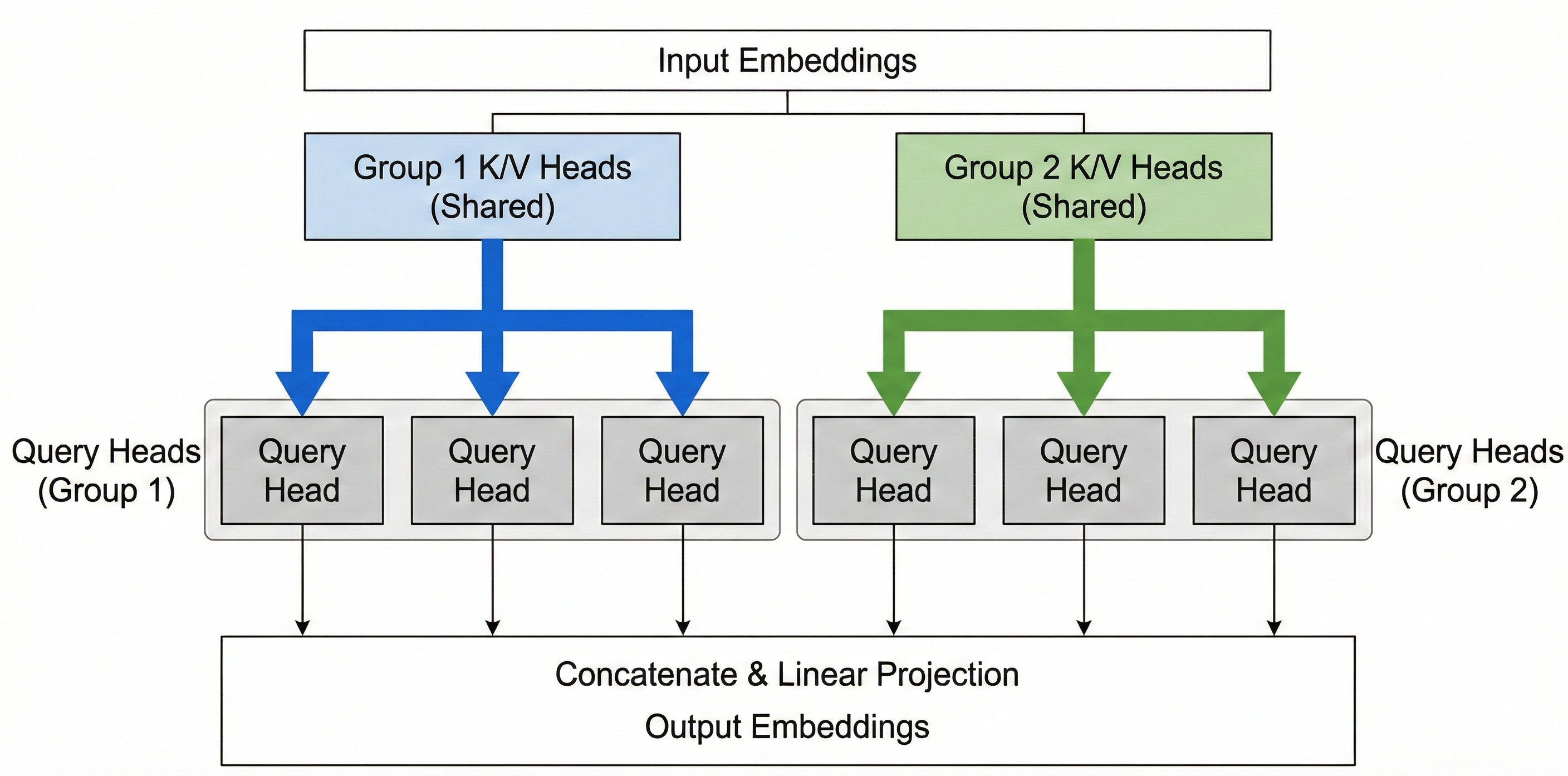 Suppose we have eight attention heads (H=8). With GQA we might decide to use, say, G=2 groups. Then we will have 2 distinct key heads (and 2 value heads) per layer. Perhaps heads 1–4 share key group 1, and heads 5–8 share key group 2. Each group has its own W_K and W_V projection matrices. At inference, each new token yields 2 key vectors and 2 value vectors (instead of 8 each in MHA). Each of those is then used by 4 query heads (whichever heads belong to that group).