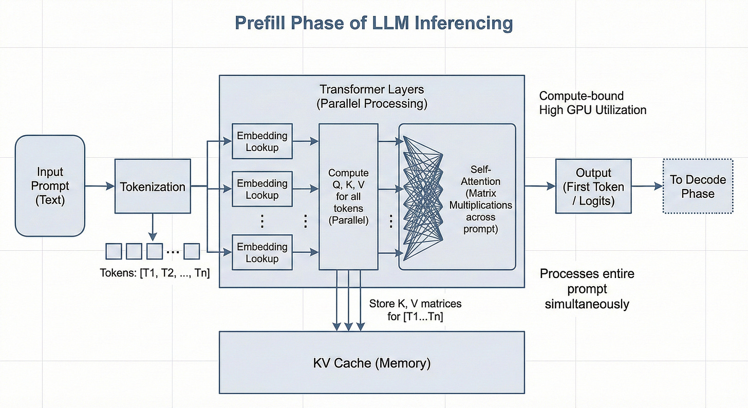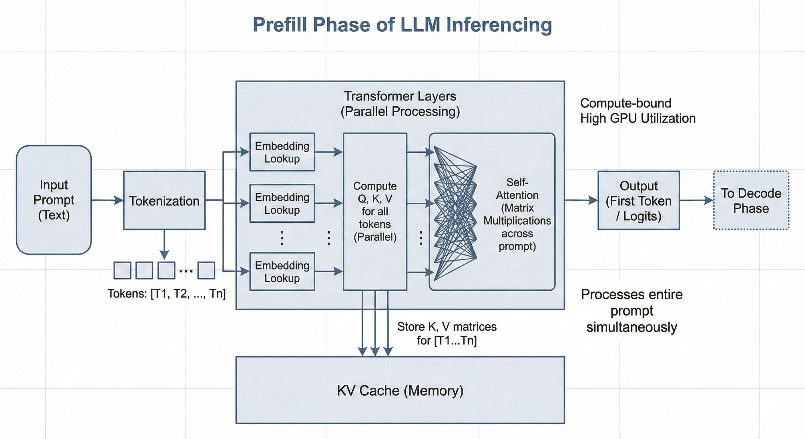 When a user submits a prompt, the model processes all input tokens in parallel. The Query (Q), Key (K), and Value (V) projections are matrix-matrix multiplications (GEMM), where the model weights are loaded once from High Bandwidth Memory (HBM) into the on-chip SRAM (Static Random Access Memory) and reused across the large batch of input tokens.